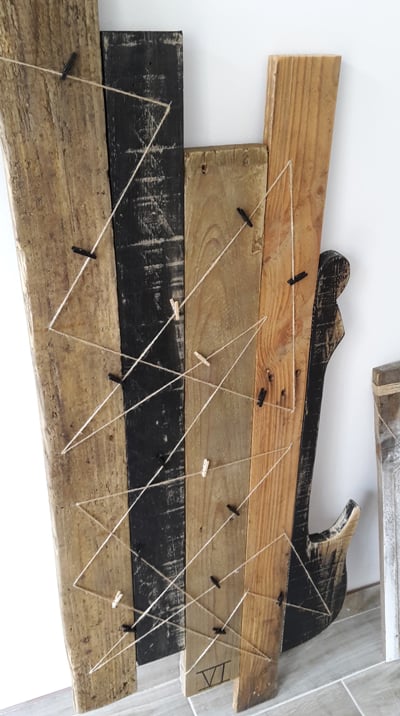 Ce pêle-mêle en bois est composé de fils tendus et d’épingles pour suspendre environ 15 photos.